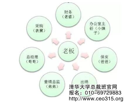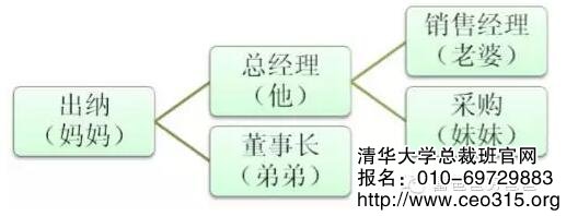 他是總經理,他弟弟是董事長,他媽媽做出納,老婆做銷售經理,采購是他妹妹。結果,現在媽媽都70多歲了,還不退休,他呢,做任何的工作都要向媽媽匯報,因為按照家庭關系來說,她是他媽媽,是他的行政長官。